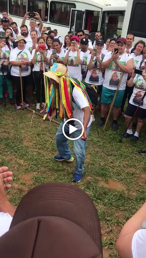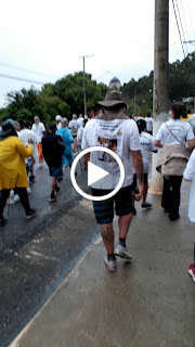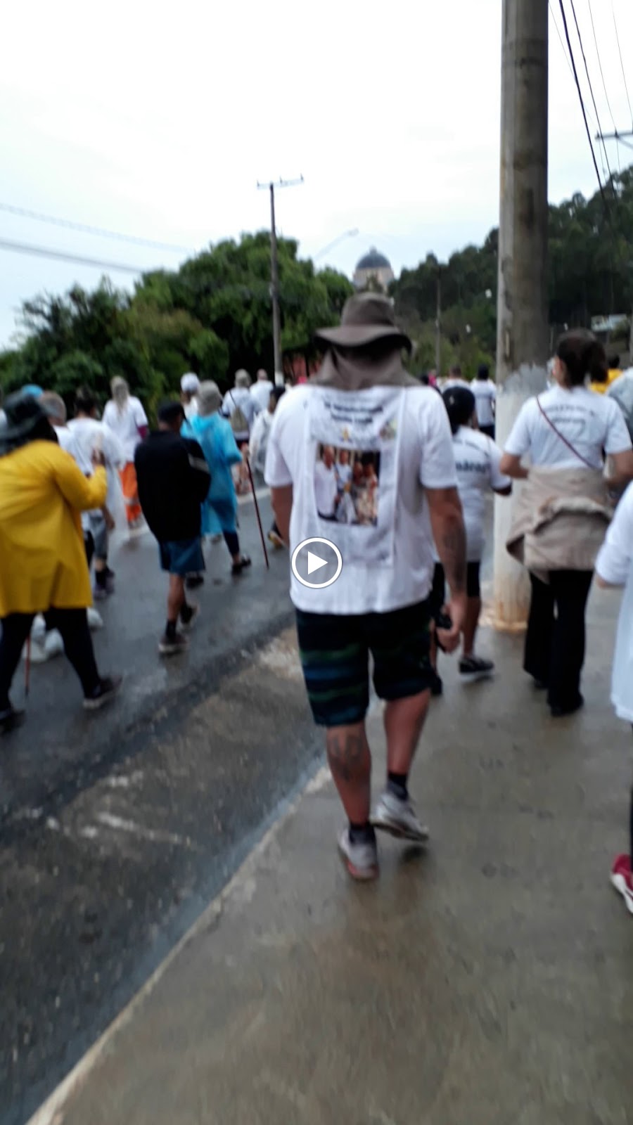 quando ele veio ao meu encontro ,comecei a tremer e chorar . Quanta felicidade junta. Ele continuou de carro e eu fui a pé ,faltava tão pouco para o ponto de encontro .Perto da entrada de Aparecida no trevo fomos recepcionados com um grande churrasco e aguardamos todos chegarem .Os ultimos kms foram feitos com chuva ,alias choveu muito mas a fé em chegar era maior que tudo.